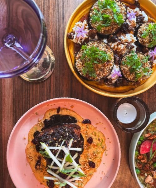 Aubergine laquée érable & grenade • Crumble pistache & ail fumé • Sicak houmous au potimarron • Châtaignes grillées • Huile épicée infusée à la tomate • Brousse & fleur d’ail
