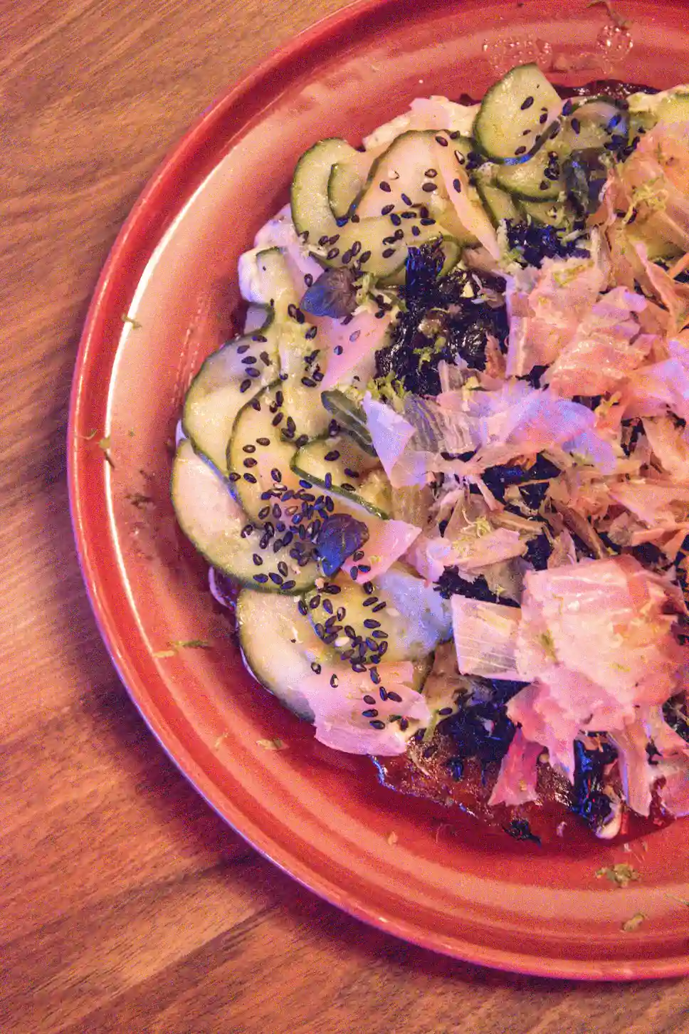Galette takoyaki poulpe • Daïkon • Cébette • Mayonnaise japonaise à la truffe • Concombre et gingembre marinés au sésame grillé • Bonite séchée & algues croustillantes