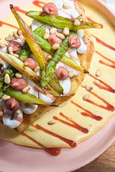 Foccacia à la sariette • Crème de chèvre frais • Compotée de rhubarbe • Sabayon au miso • Asperges vertes grillées • Réduction fraise et pignons de pin